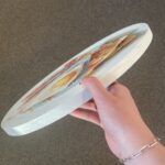 This painting is on circular wood panel, the sides are painted white to match the background. There is a wire at the back for hanging.