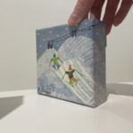 Mixed media painting (collage and acrylics) on canvas with a sawtooth hanger attached to the back for hanging.