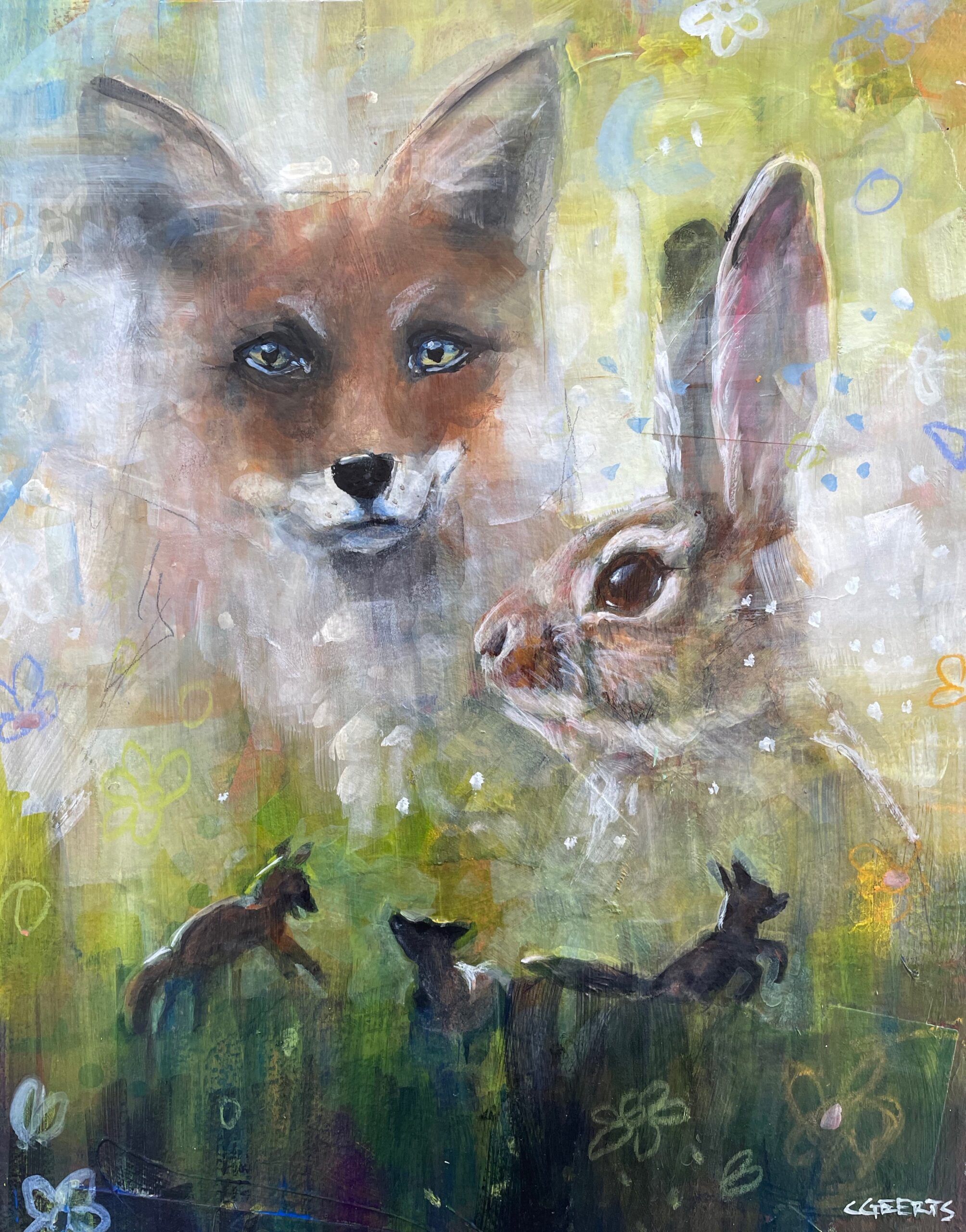 Artist: Connie Geerts Title: A Rabbit’s Story Medium: Acrylic on Panel Size: 14″ x 11″
