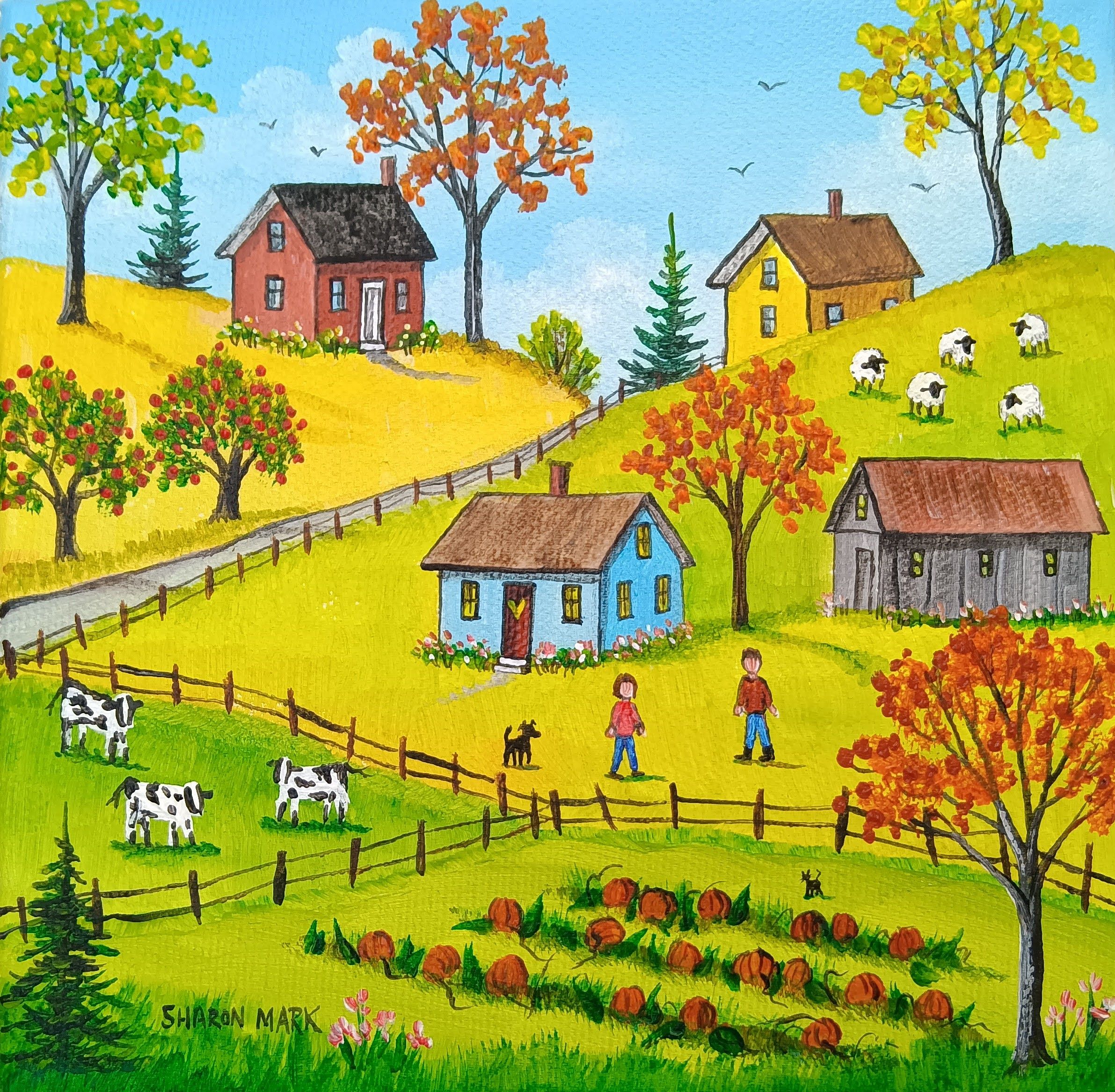 Artist: Sharon Mark Title: Little Fall Farm Medium: Acrylic on Canvas Size: 6″ x 6″