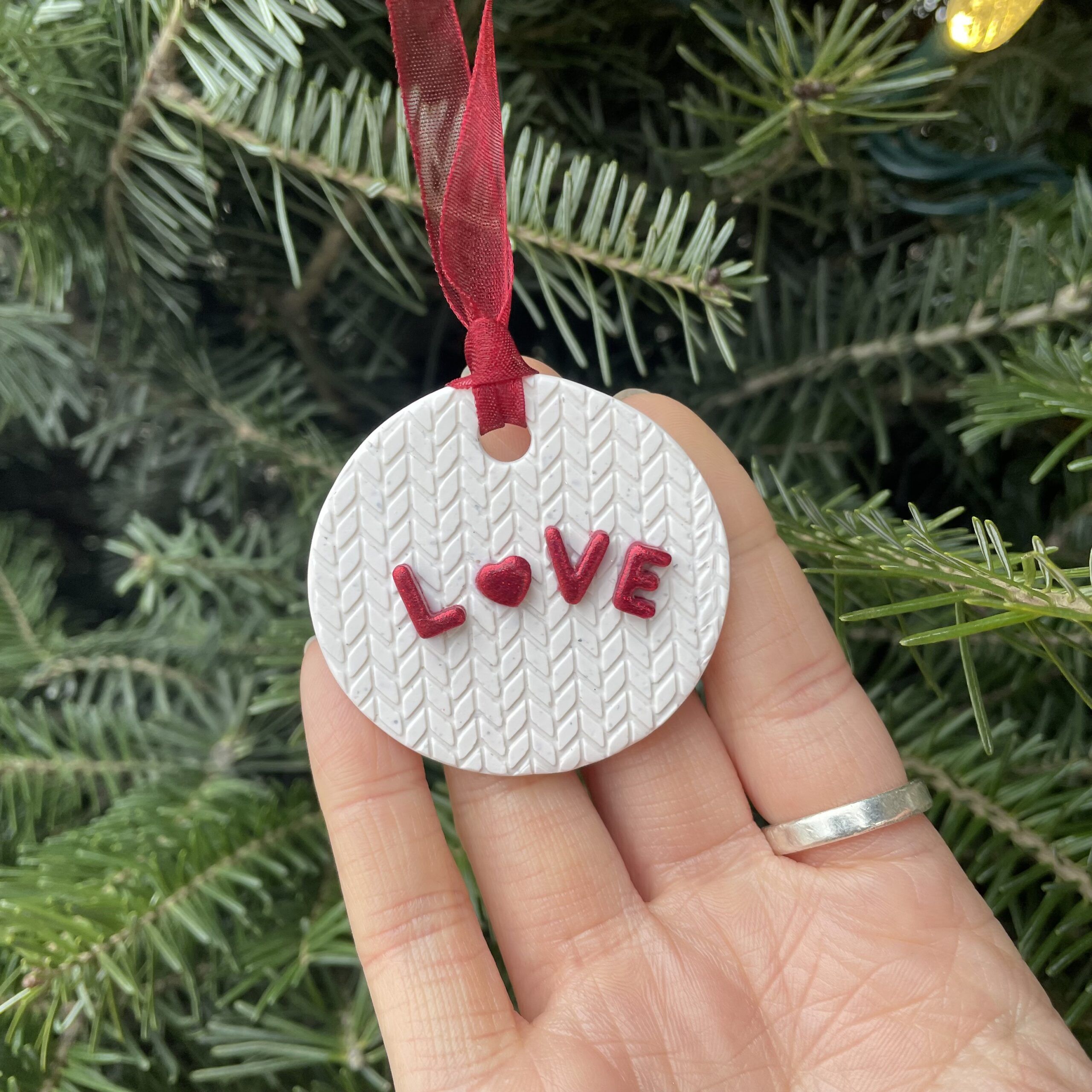 Polymer clay handmade ornament with sweater-like texture and relief letters. Red ribbon for hanging.