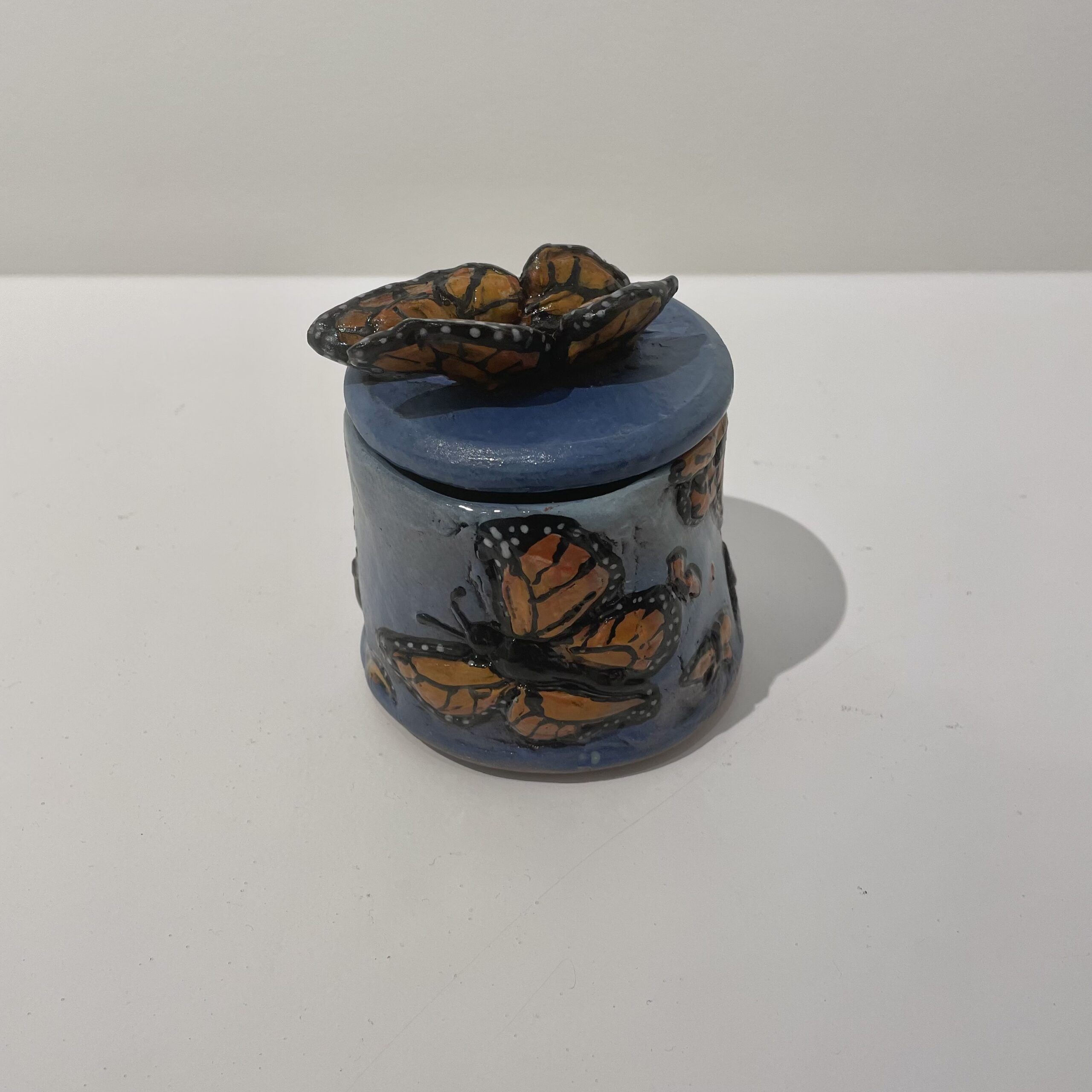 Catch-all jar with lid and relief monarch butterflies pattern.