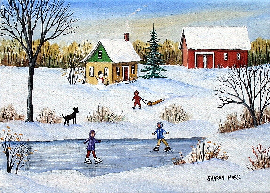 Artist: Sharon Mark Title: Skating at the Creek Medium: Acrylic on Canvas Size: 5″ x 7″