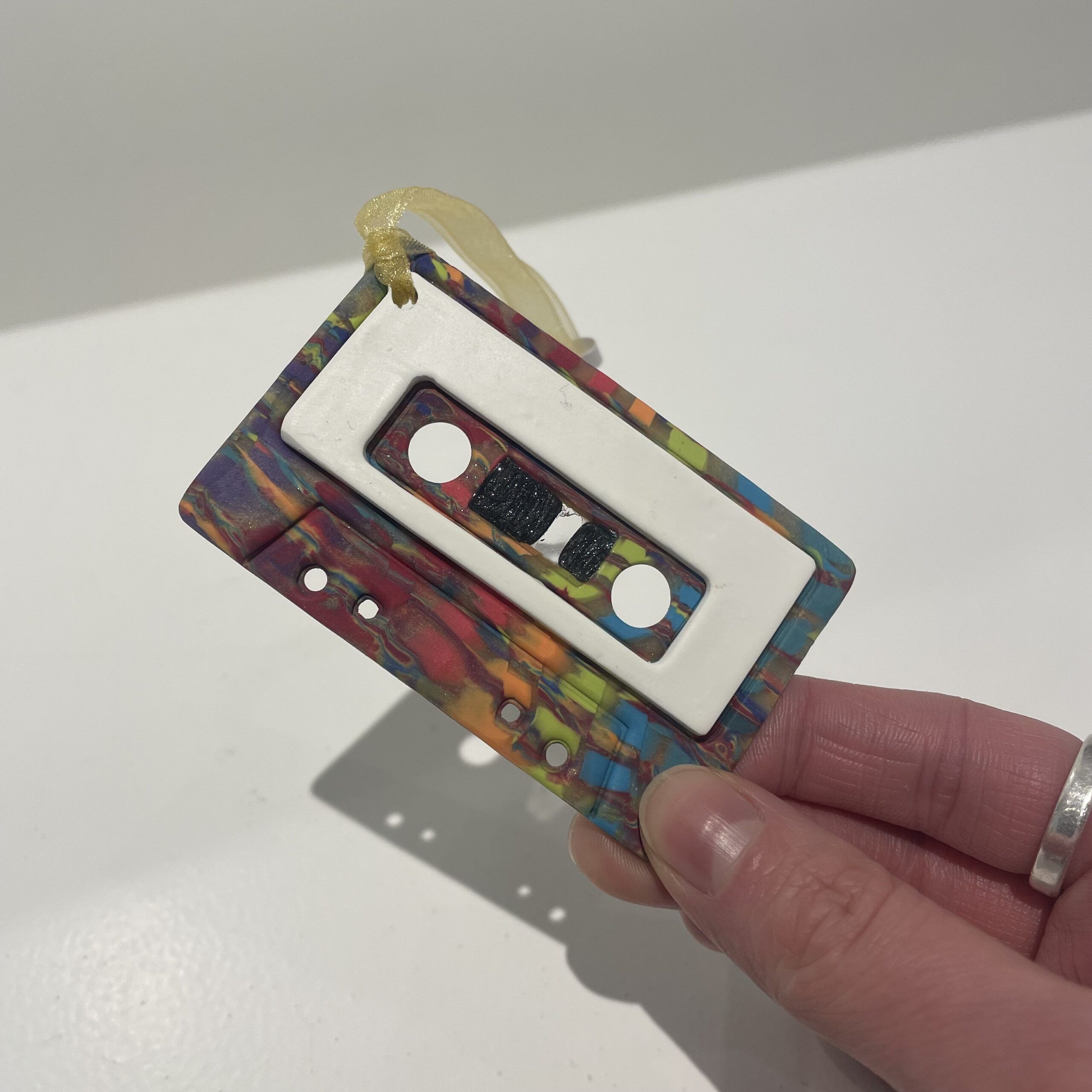 Light-weight polymer clay ornament with resin centre, gold ribbon, ready to hang on the tree. Use permanent marker to customize it further!