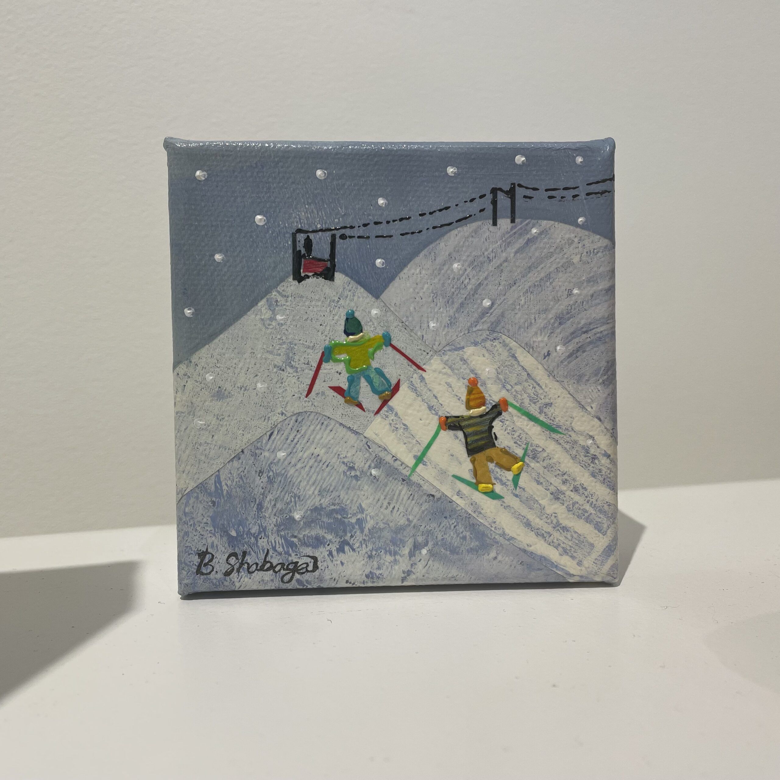 Mixed media painting (collage and acrylics) on canvas with a sawtooth hanger attached to the back for hanging.